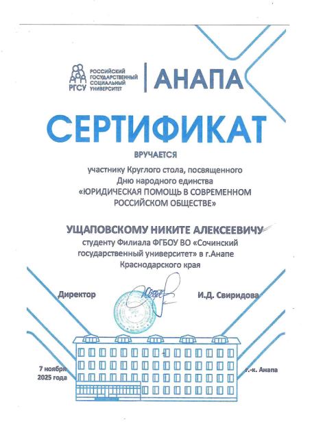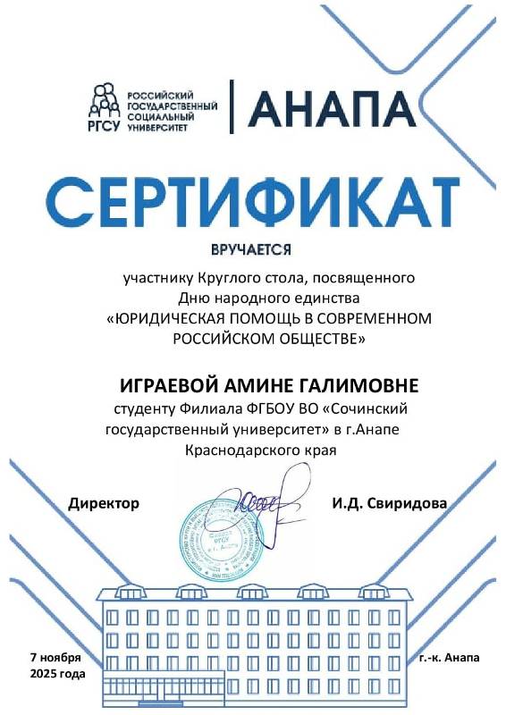 7 ноября 2025 года студенты группы 23-ГД-А приняли участие в круглом столе, посвященном Дню народного единства «Юридическая помощь в современном российском обществе», который состоялся в филиале РГСУ в Анапе.